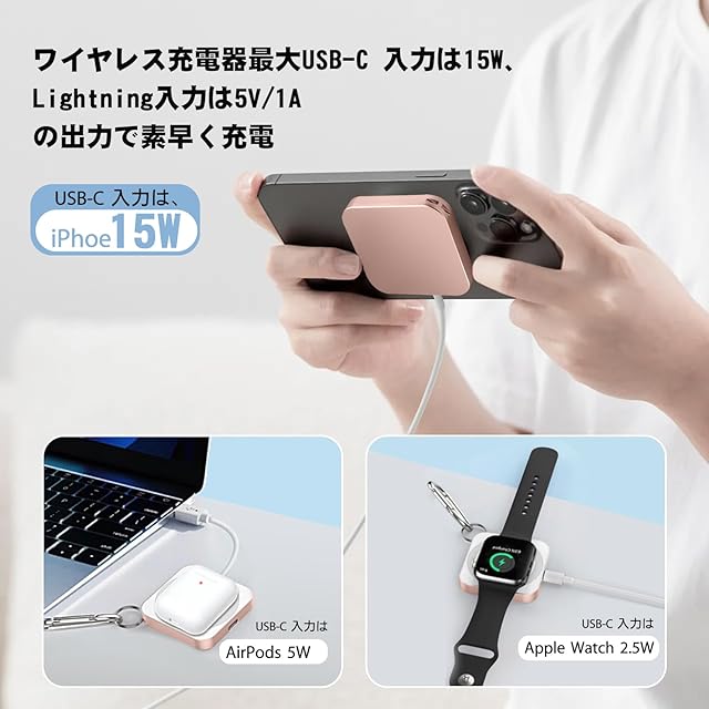 【3 in 1ワイヤレス充電器】新設計の登場!このコンパクトな充電器は、USB-CとLightningケーブルに対応した2つの充電ポートを備えており。USB-C 入力は、iPhoe 15Wで充電できます、アップルウォッチ 2.5Wで充電できます、AirPods 5Wで充電できます。Lightning 入力は、5V/1Aに対応でき。電線の乱れやごちゃまぜがなくなり、スペースがスッキリになれます。忙しい毎日でも、手軽に充電できるから安心です。ただし、携帯電話の温度が上昇すると、充電電力が自動的に減少します。携帯の高温充電を避けるようにお願いします。注意:このワイヤレス充電器は、充電ケーブル(USB-C/Lightning)と一緒に使用する必要があります。また、内蔵バッテリーは含まれていませんのでご注意ください。