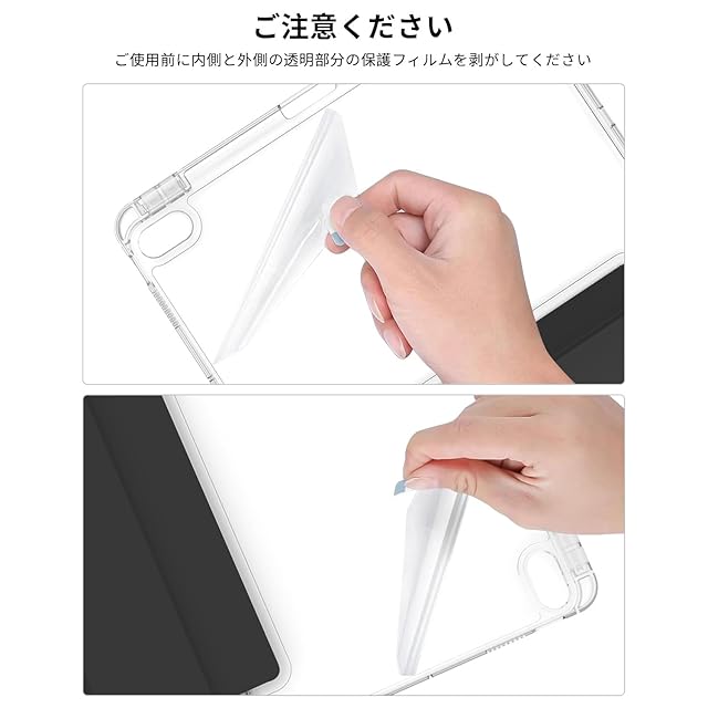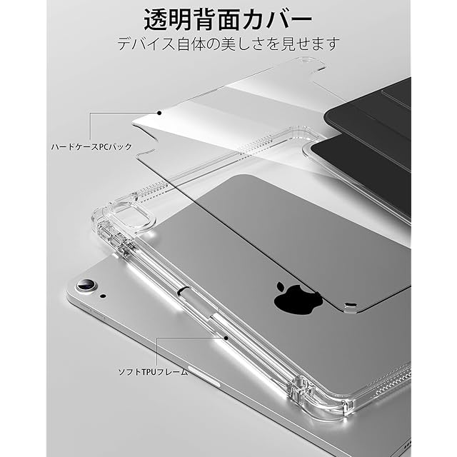 【透明な背面カバー】表面はPUレザー素材で作られ、裏面は透明なアクリル素材で作られ、デバイス自体の美しさを見せます。フレームには衝撃に強い柔軟なTPUを採用し、軽量かつ極薄で、四隅にクッション性のあるソフトフ、落下によるダメージを防ぎます。 (注意: 透明バックカバーの内側と外側に傷防止保護フィルムの層があります。使用前に保護フィルムを剥がしてください)