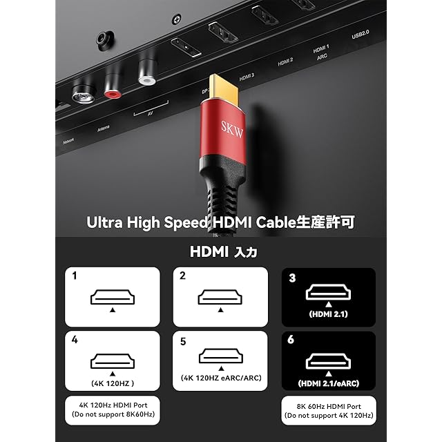 商品名:SKW HDMI ケーブル 48Gbps超高速 HDMI 2.1 ケーブル 8K@60Hz/4K@120Hz/2K@144Hz対応 PlayStation/Xbox/Switch/PC/TV等適用 HDMIケーブル 7.6M