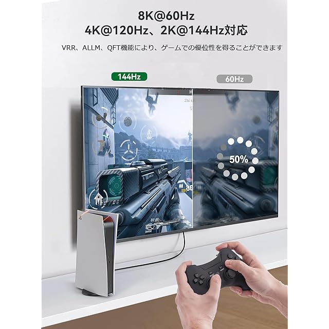 【ゲームモード】:HDMI 2.1では可変リフレッシュレートを採用することで、特にゲームの利用に威力を発揮します。VRR・ALLM・QFT機能の上で、画面割れとカクつきを最大限に解消され、超低遅延を実現する。「QMS」は、デバイスがあるHDMIフレームレートから別のフレームレートに変更する際にしばしば発生する遅延を排除する機能です。