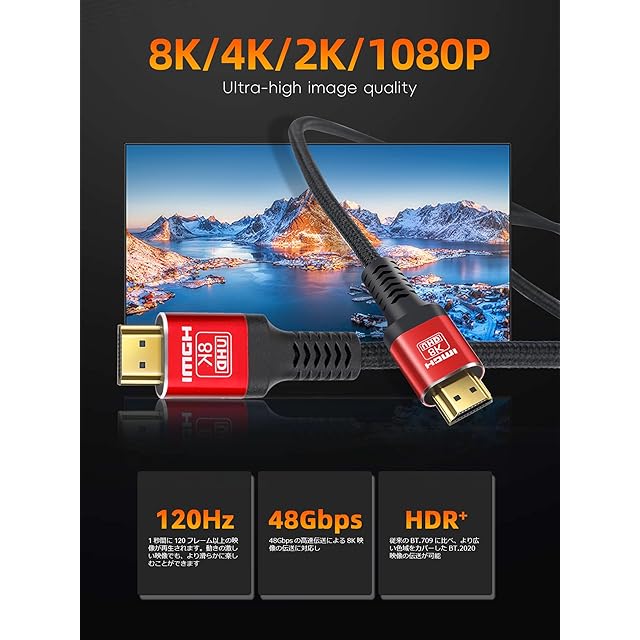 【HDMI 2.1 規格】:HDMI 2.1 ケーブルは帯域幅を48Gbpsまで拡張し、8K@60Hz、4K@120Hz、2K@144Hz、3D、イーサネット、eARC、HDR 4:4カラーフォーマット、48ビット/px 色深度をサポートします。HDMI2.0b/HDMI2.0a/HDMI2.0/HDMI 1.4/HDMI1.3/HDMI1.2/HDMI1.1との下位互換性があります。