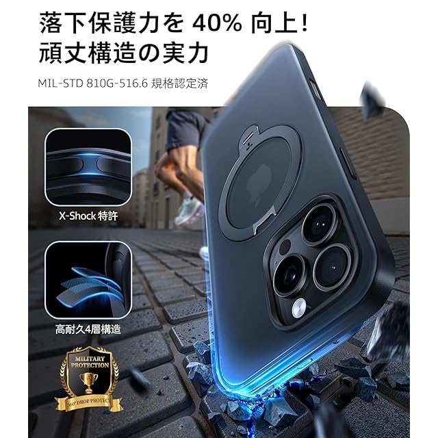 【米軍規格・高額な修理代を心配なし】Ostand Spin は 2024 年最新型の 3 層構造ショックアブソーバーを搭載し、航空級アルミニウムフレームスタンドと耐摩耗 PC を組み合わせた軍規級保護ケース。日常では電車の混雑で落としたり、登山中に岩石にぶつけたりしても端末を傷から守り、すぐに動画撮影や SNS 投稿が続行できる。米軍規格 MIL-STD-810H をクリア(認証番号:GZMR220300651)し、端末コーナーに 0.5mm 段差設計を施して画面とカメラを保護し、3m 高さから 100 回落下しても亀裂を生じにくい。-20℃~60℃の温度変化や湿度 95% 環境下でも材質劣化せず、薄型デザインが iPhone のデザインを損なわず、グリップ性のある表面処理で滑落リスクを軽減。