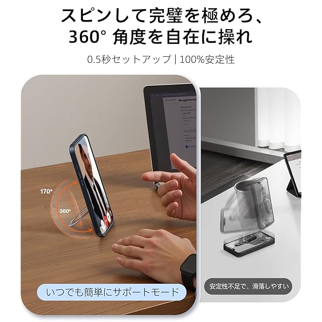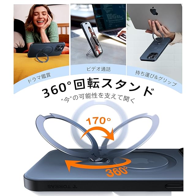 【耐久性・安定性・高級感全て揃えた】TORRAS Ostand Spin は、金属ギア構造で確かなロック感を生み、航空級アルミニウムとマット PC 素材を採用。縦 90°~横 180° まで角度自在に調節し、5000 回以上の開閉試験をクリアした耐久性を備え、指紋・キズに強い。独立したカメラコントロールが本体キーを保護:専用キーでカメラ操作を可能にし、iPhone の電源キーや音量キーへの負担を軽減。長期使用でも本体キーの劣化を防ぎ、端末全体の耐用性を向上させる。カフェで 60° 傾けて iPhone を立てれば、レポート作成中でも片手でメール確認。金属ギアの精密設計で何度微調整してもズレなく、マット表面は光反射を抑え、明るい場所でも高級感と視認性を維持する。