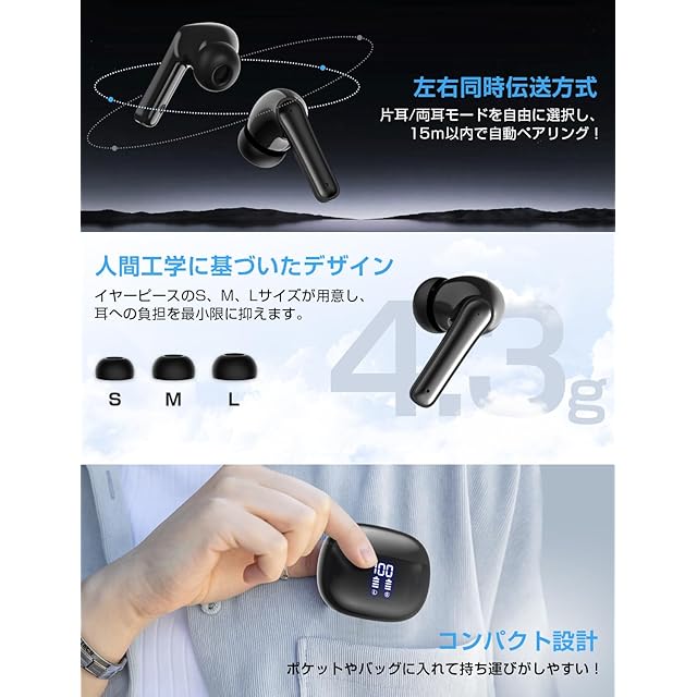 【スタイリッシュなケース&究極の快適フィット】光沢がありながら指紋が付きにくく、清潔感を保つ充電ケースがこのワイヤレスイヤホンの特徴です。洗練された丸みを帯び、わずか39.8gの軽量設計は便利でスタイリッシュ。持ち運びもラクラク!マグネットが内蔵されており、Bluetoothイヤホンを安全に収納でき、落下の心配もありません。可愛らしく実用的なデザインが、日常生活をより魅力的に彩ります。4.3グラム(片側イヤホン)の超軽量・コンパクト設計と柔らかな素材が、圧迫感を軽減!本イヤホンは重量を極限まで削減し、耳への負担を最小限に抑えます。ブルートゥース イヤホンを身に着けていることを忘れるほどの軽さで、自由な動きを実現!イヤーピース(耳栓)のS、M、Lサイズが用意されていますので、合ったサイズを選べば、かなり外れにくくなります。人間工学に基づいたデザインが、日本人の耳の形に非常に合う、快適なフィット感を提供します。長時間の使用でも疲れにくく、オンライン会議や授業など長時間利用のシーンでも快適にご利用いただけます。忙しい日常でも、この小型のイヤホンならストレスフリーです!