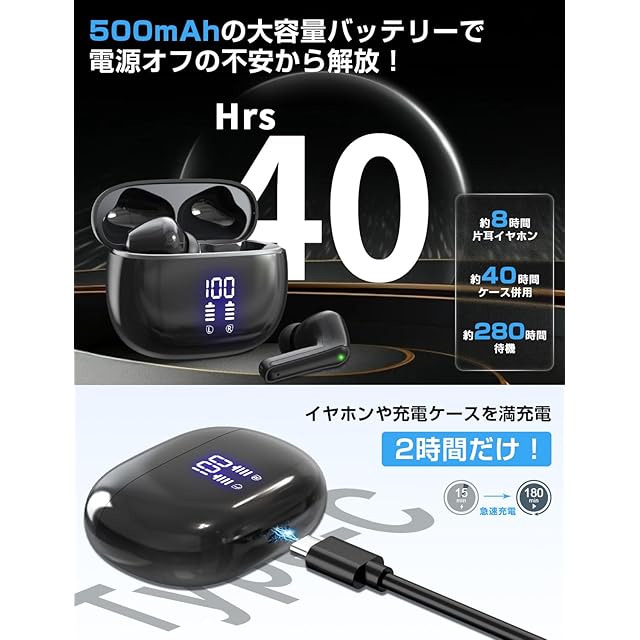【長時間再生&LEDディスプレイ搭載】驚くほど強力で安心のバッテリーが、8時間のノンストップ音楽を楽しませてくれます。充電ケース(500mAh)と組み合わせると、最大40時間の再生が可能です。さらに、15分の充電で約180分以上の再生が可能な短時間充電にも対応しています。リンク時のエネルギー消費を低減し、待機時間はなんと280時間も!わずか2時間で充電が完了し、ケース(Type-C充電ケーブル付き)が満充電されると、イヤホン本体を約2.5回分充電できます。(※電池劣化を防ぐため、定期的にケースに給電してください。)⚡急速充電機能と長時間のバッテリー寿命で持続時間を気にせずに一日中楽しめます。旅行や学習の合間にも頼りになるパートナーです。外出先でも、バッテリー切れる心配はありません!LED残量表示が装備されるため、ブルートゥース イヤホンの状態が一目瞭然です。ディスプレイの数字は、0から100%まで明確に表示できます。数字LEDディスプレイにより、イヤホン bluetooth接続状況や充電状態を一目で確認でき、もっと簡単に使えます!