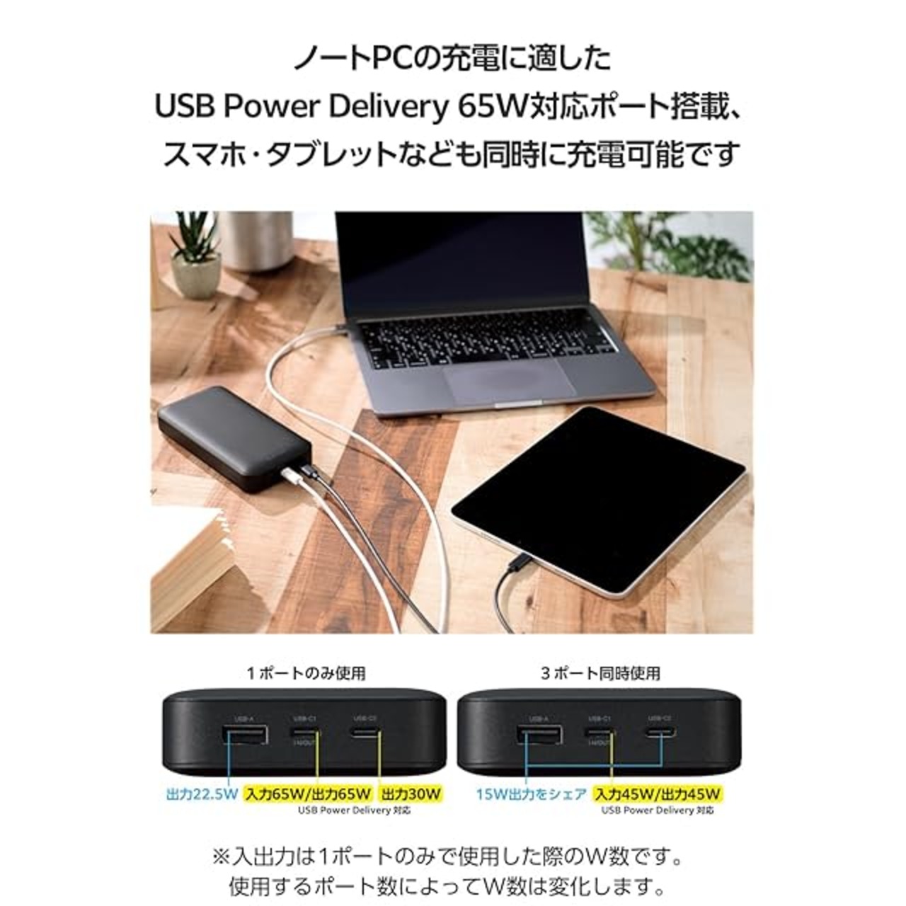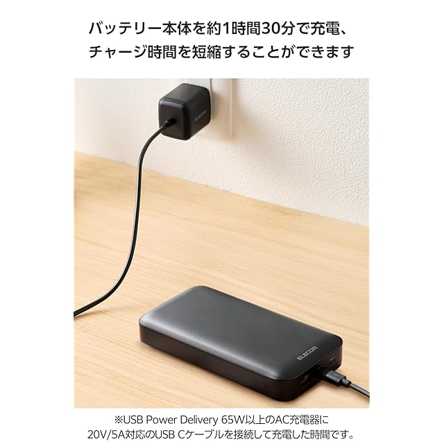 USB Power Delivery 65W出力に対応し、パソコン、スマートフォン、タブレットを高速充電できる、20000mAhモバイルバッテリーです。