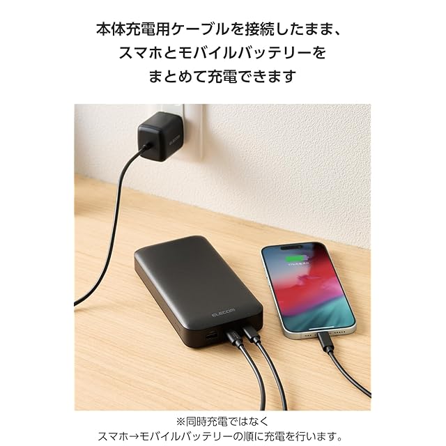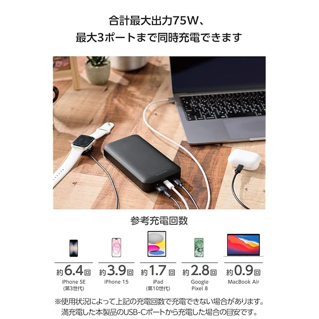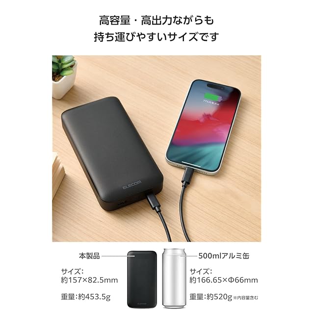 商品名:エレコム モバイルバッテリー 20000mAh 合計75W / 65W(単ポート) USB PD対応 3ポート Type-C×2 USB-A×1 大容量 C-Cケーブル付属 【 iPhone 16 15 Pixel OPPO iPad10 9 等対応】 ブラック EC-C17LBK