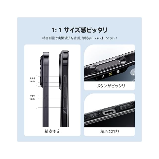 【完璧なフィット感・超精密設計】精密機械測定で厳密に寸法を測定し、誤差ゼロの1:1密着度を実現。隙間なく本体にぴったりフィットし、全てのボタンも完璧に合わせて、優れた押し心地を提供します。ケースを装着したままでもスムーズな操作が可能。精細な設計と精密な加工、厳選素材のハイブリッド構造で、驚異的な装着感を実現しました。