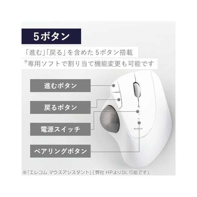 Webブラウザやフォルダの操作時に便利な「進む」、「戻る」ボタンを含めた5ボタンを搭載しています。ボタンの機能割り当ては、無料でダウンロードできる「エレコム マウスアシスタント」を利用して変更可能です。