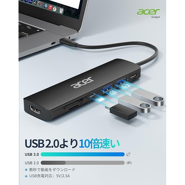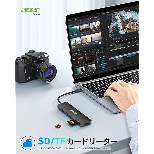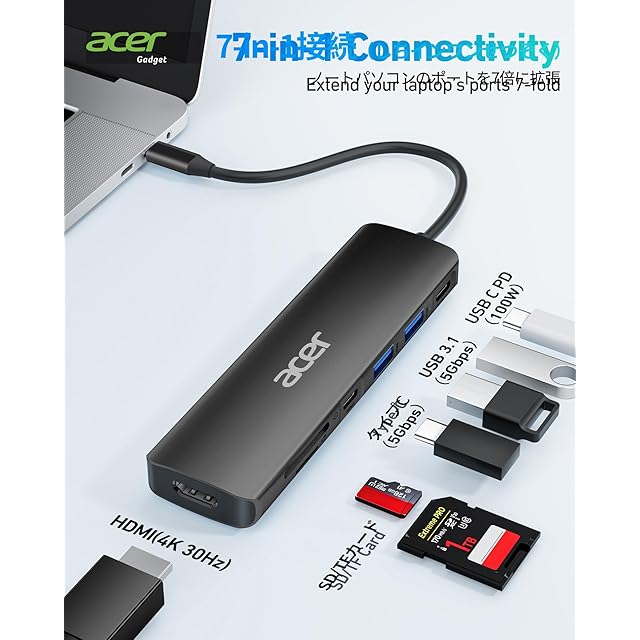 商品名:Acer USB C ハブ 7-in-1 USB Type C 3.1 ハブ 4K HDMI ハブ、USB Cハブ 5Gbps 高速転送, 2*USB 3.1 ポート Power Delivery 100W 急速充電、SD/TF カードリーダー Type-Cアダプター iPad Pro、MacBook Pro、iphone 15 pro などに対応 (ブラック)