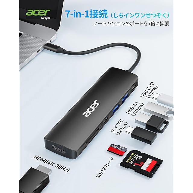 Acer USB C ハブ 7-in-1 USB Type C 3.1 ハブ 4K HDMI ハブ、USB Cハブ 5Gbps 高速転送, 2*USB 3.1 ポート Power Delivery 100W 急速充電、SD/TF カードリーダー Type-Cアダプター iPad Pro、MacBook Pro、iphone 15 pro などに対応 (ブラック) | TREND DESIGN 家電専門店