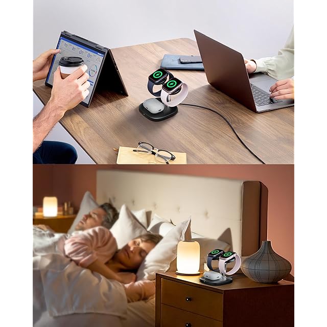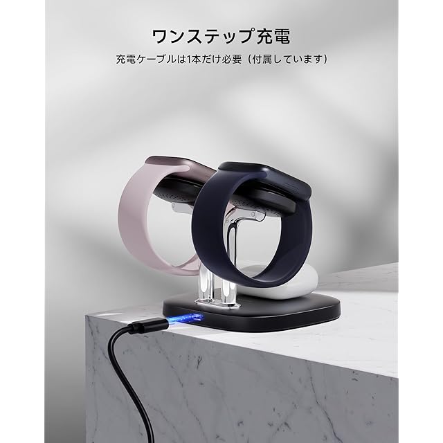 【3in1充電|2台のApple Watchに対応】2台のApple Watchとイヤホンを同時に充電可能。ご家族やカップル、同僚とシェアするのに最適な設計です。