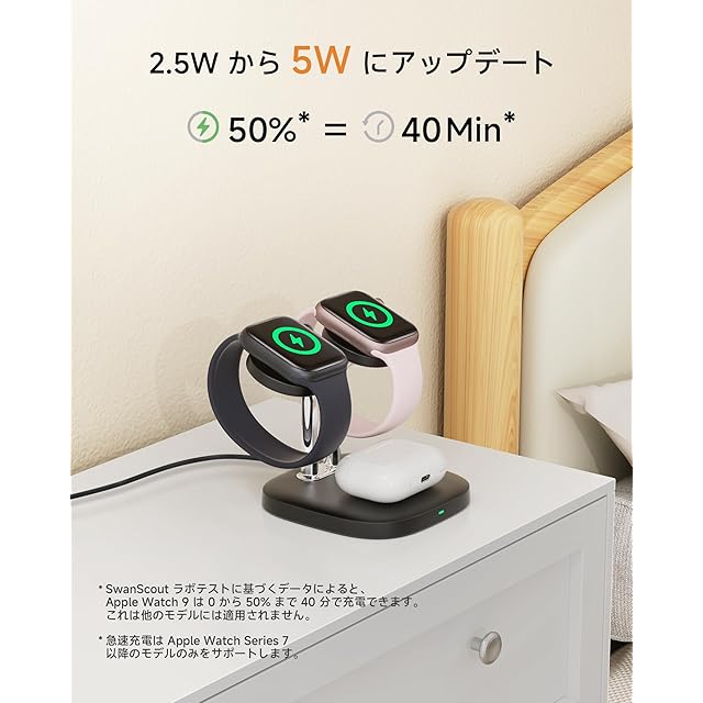 【Apple Watch対応・5W急速充電】従来の2.5Wから5Wにバージョンアップ!Apple Watch 10を約1.3時間でフル充電可能。忙しい朝や就寝前の短時間でも、しっかりチャージできます。
