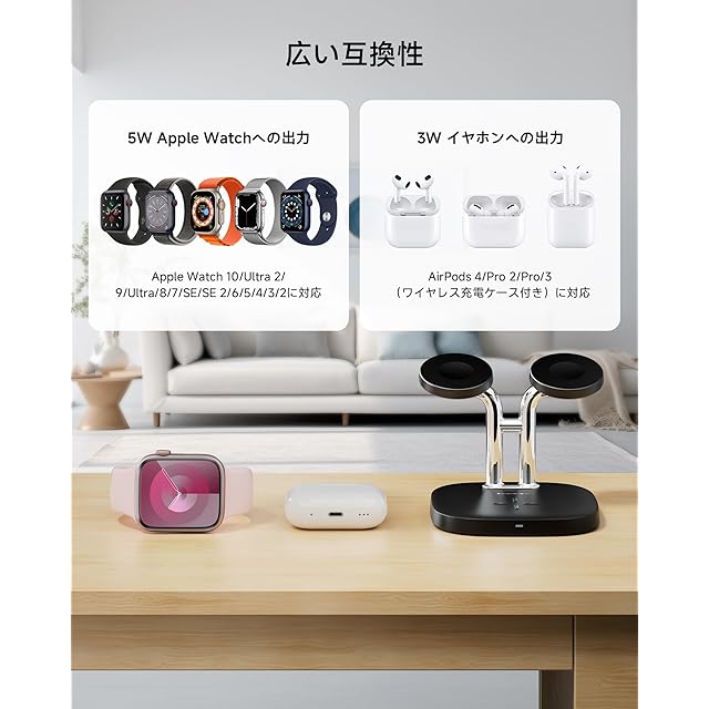 【幅広い互換性】Apple Watch Ultra 2/Ultra/SE 2/SE/10/9/8/7/6/5/4/3/2に対応。AirPods Pro/Pro 2/3/4(アクティブノイズキャンセリング搭載)などのワイヤレス充電対応イヤホンも充電可能。