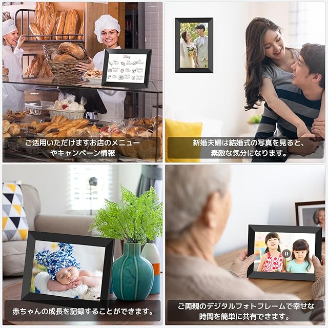 【縦ヨコ自動変換機能・スライドショー】縦横どちらの写真も表示でき、フレームの配置方向を調整する必要はありません。写真を自動で切り替えながら表示するスライドショー機能にも対応しています。スライドの切り替え間隔(5秒/10秒/30秒/1分/5分/30分)を設定できるので、店舗のインフォメーションとしての活用にも便利です。音楽が再生出来ません。