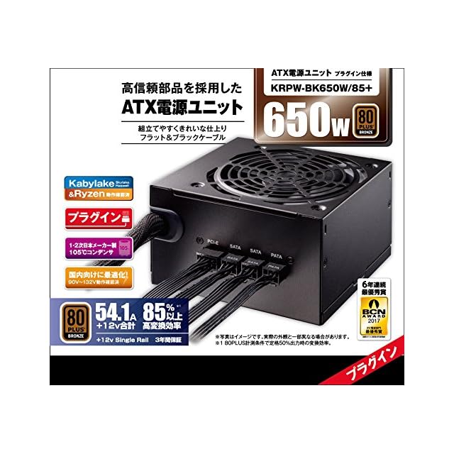 商品名:玄人志向 電源ユニット 650W ATX 電源 80 PLUS ブロンズ PC電源 プラグイン KRPW-BK650W/85+
