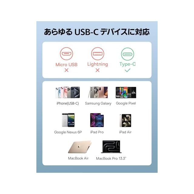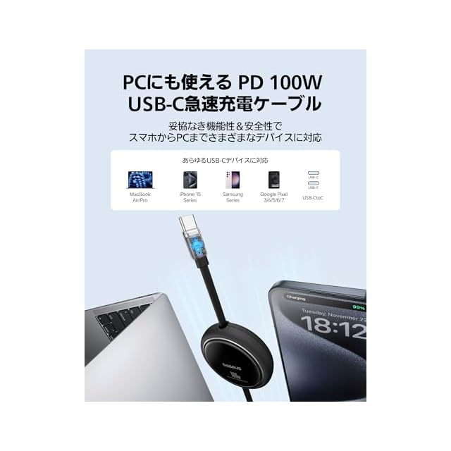 【あらゆるUSB-C機器に充電可能】あらゆるUSB-Cデバイスを充電できる、多彩な互換性を備えています。旅行時にも頼りになる、コンパクトな巻き取り式USB-Cケーブル。(充電と480Mbpsのデータ転送に対応しており、ビデオ転送には対応していません。)