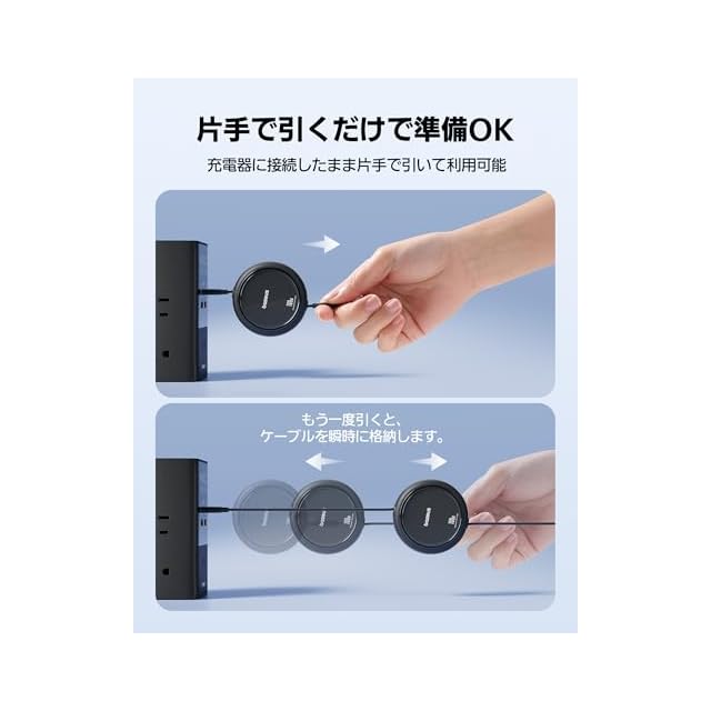 【完全巻き取り式・耐久性抜群】 巻き取り式のUSB-C充電ケーブルは、引っ張るだけで簡単に収納でき、スペースを節約。絡まりやすいケーブルや散らかりやすい充電環境とは無縁です。50,000回以上の引っ張りテストに耐える耐久性を実現。いつでも安定したパフォーマンスを提供し、ケーブル交換は長期間不要です。