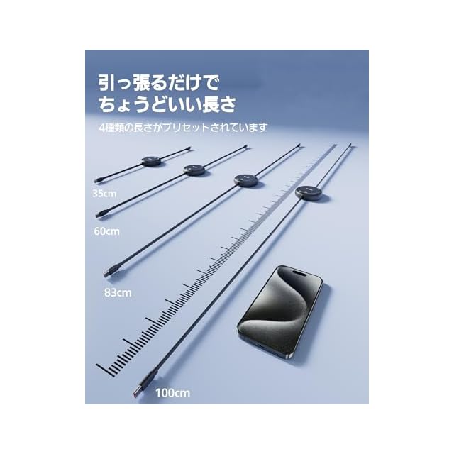【両側とも伸縮可能】市販のケーブルとは異なり、この Baseus Free2Draw 100W 巻取り式のTypeCケーブルは片側が引かれると、両側も同時に引っ張られて、長さが自在に調整可能。いつでも充電にベストな長さを実現します。(4レベル調整可能:35cm、60 cm、83cm、100cm)