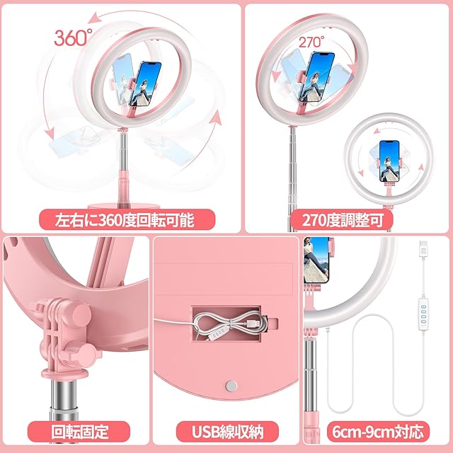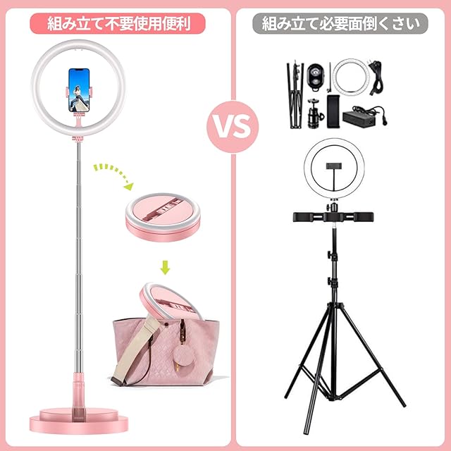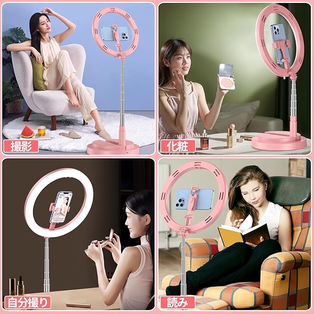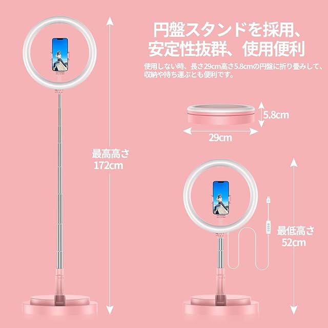 商品名:LEDリングライト 自撮りライト 折畳み式 スタンド一体式 11.4インチ 照明 高輝度 三色モード 10段調光 収納省スペース 携帯便利 スマホホルダー付き 撮影用 卓上スタンド Youtubeビデオ/TIKTOK/自撮り/美容化粧/カメラ撮影に適用(二代ピンク)