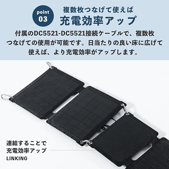 【複数枚つなげて充電効率アップ】付属のDC5521-DC5521接続ケーブルで複数枚の連結が可能です。日当たりの良い床に広げて使えば、より充電効率がアップします。