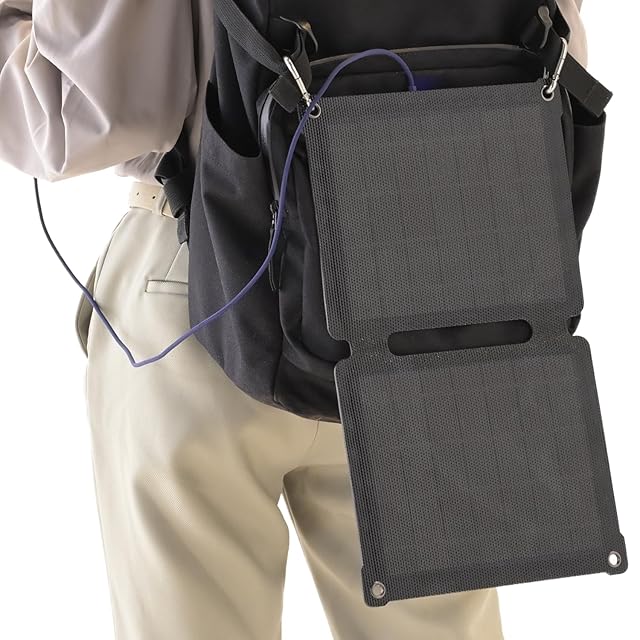 【軽量&コンパクト】リュックにつけて使える軽量コンパクトタイプのポータブルソーラーパネル。通勤中、サイクリング中、ビジネスでの移動中にもっと気軽に『太陽光を使って充電したい』という方におススメです。スマホやパソコンなどの急な充電にも対応できます。