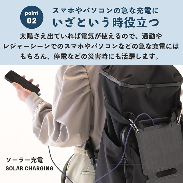 【いざという時役立つソーラー充電】太陽さえ出ていれば電気が使えるので、停電などの災害時にも活躍します。カラビナが2個付属しており、テントに取り付けたり、ベランダなどに吊り下げても充電ができるため、どこでも手軽に充電ができます。