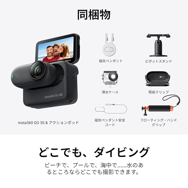 Insta360 GO 3S - 4K小型ウェアラブルVlogビデオカメラ、ハンズフリーPOV、どこでもマウント、手ブレ補正、バッテリー寿命140分、10m防水、AI編集、Apple Find My対応、Vlog/旅行/アウトドア/ペットPOV用 ウォータースポーツキット - 128GB