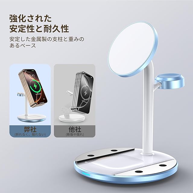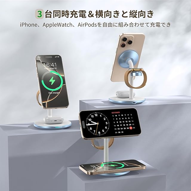 【滑り止め&省スペース】これ1つだけでデスクでのすべてのAppleデバイスを同時にワイヤレス充電できるため、悩みのケーブルとさようなら、デスクをスッキリ整理できます。三つの充電パッドを搭載して、をお好きに組み合わせて3台同時に充電できます。底面は滑り止めシリコン付き、充電時magsafe 充電スタンドが動いたり反転したりすることはありません。