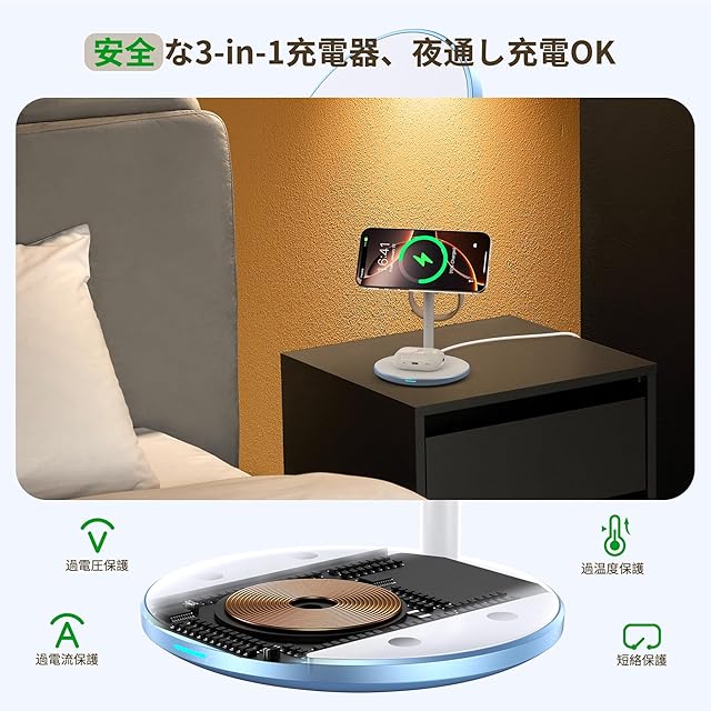 【3 in 1マグネット式ワイヤレス充電器スタンド】iPhone、Apple Watch、ワイヤレスイヤホンをこの1つのmagsafeワヤレス充電器だけで一度に充電できます。上部のmagsafeワイヤレス充電器はiPhone16 / 16 Plus/ 16 Pro/ 16 Pro Max、iPhone15 / 15 Plus/ 15 Pro/ 15 Pro Max、iPhone14 / 14 Plus/ 14 Pro/ 14 Pro Max、iPhone13 / 13mini/ 13 Pro/13 Pro Max、iPhone12 /12 mini/ Pro/12 Pro Max、MagSafeケースなどと互換性があります。Whatchワイヤレス充電器はApple Watch Ultra2 /Ultra /9 /8 /7 /SE /6 /5 /4 /3 /2 /1と互換性があります。台座のワイヤレス充電器はワイヤレスイヤホン3/2/Pro、ワイヤレス充電対応のスマホと互換性があります。ご注意:台座でのワイヤレス充電器の最大出力は5wです。