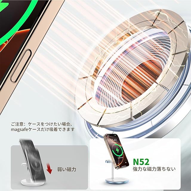 【安定且つ安全的なマグセーフワイヤレス充電】このmagsafeワイヤレス充電器は、iPhone 16/15/14/13/ 12シリーズを2.5〜3時間で0%から100%まで充電できます。アップルのMag-Safe充電器とほぼ同じな充電スピードです。改良された安全システムとCE、FCC、およびQi認証を備えてるので、高速且つ安全的な充電を確保します。