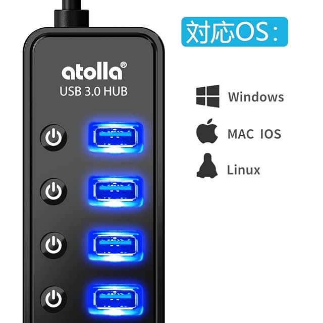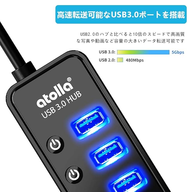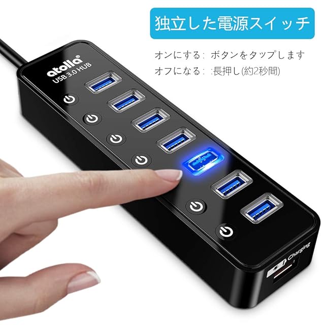 商品名:USB ハブ atolla USB 3.0 Hub 7ポート増設 + 1充電ポート, USB拡張 セルフパワー/バスパワー 【独立スイッチ付・5V/4A ACアダプタ付き・100cm USBケーブル】