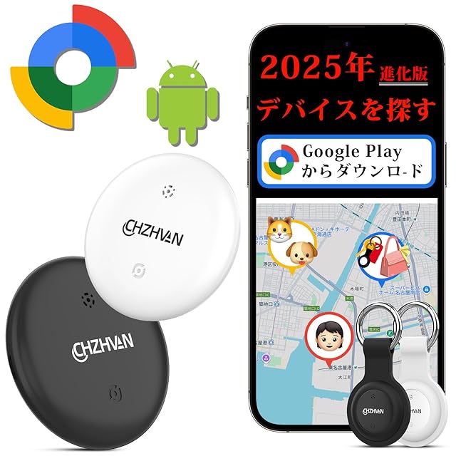 商品名:CHZHVAN エアタグ Android 【Google公式認証】スマートタグ Android (2個セット) エアタグ 2025最新 紛失防止タグ Google「検索ハブ」に対応 電池交換 GPS 追跡 小型 忘れ物防止タグ アンドロイドのみ対応 鍵・財布・ペット用 キーホルダー付属