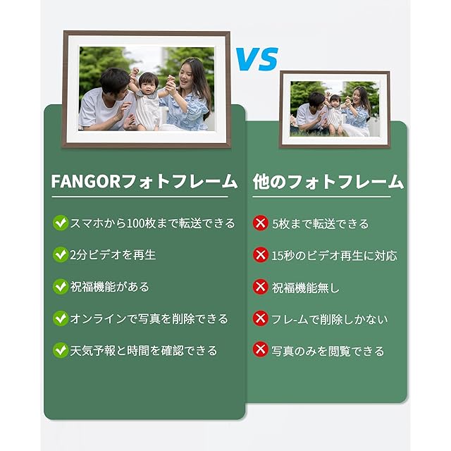 Fangorデジタルフォトフレームは、思い出の写真をきれいに表示できる優れた製品です。高解像度の大画面で、写真の細部まで鮮明に再現されます。さまざまなメディアに対応しており、SDカードやUSBメモリーから簡単に写真を読み込むことができます。写真の自動スライドショー機能もあり、お気に入りの写真を自動で切り替えて表示してくれます。省エネモードを搭載しているので、電力消費を抑えることができます。コンパクトで軽量なデザインなので、リビングや寝室、オフィスなどさまざまな場所に置くことができます。操作も簡単で、高齢者の方にもおすすめです。思い出の写真を生き生きと鑑賞したい方に最適なデジタルフォトフレームです。