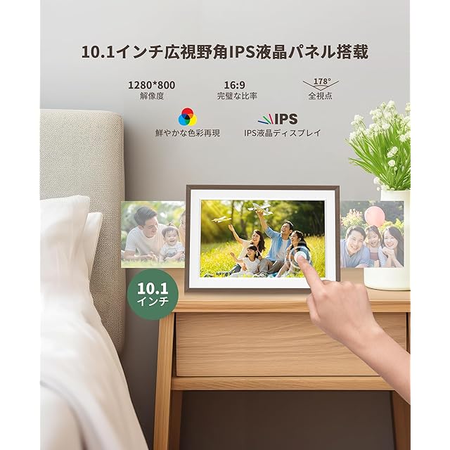 【10.1インチ高精細タッチパネル】FANGORデジタルフレームは、1280*800フルHD解像度のビデオ再生と16:9アスペクト比の優れた品質の画像を提供します。スマホより簡潔なシステムを搭載、手軽に触れて操作可能。画面の左側を指で上下にスワイプして、画面の明るさを調整します。 右側を上下にスワイプしてビデオの音量を調整します。初心者にも直感的でわかりやすい操作が可能です。フォントサイズを変更できるので、高齢者の目に優しい。