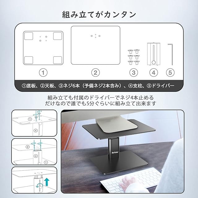 【飽きの来ないデザイン●組み立て式】モニタースタンドの表面仕上げは程よい艶消しで、非常に高級感あります。デザインもシンプルで周辺の機器と馴染みやすいです。ネジ止めして組み立てるタイプですが、分かりやすい説明書や工具を付属されており、簡単に5分内に組み立て出来ます。●梱包:板や支柱、ネジ6本(予備2本含め)、滑り止めパッド6枚、六角ネジ用ドライバー、日本語説明書など。