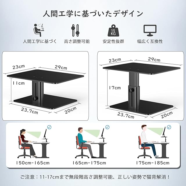 【高さ調整●作業効率アップ】モニタースタンドは支柱のネジ一つで高さを11~17cmまで稼働します。お使いの机と椅子の高さにあわせて最適な目線にディスプレイの高さを調整することができます。高さが目線に調節できることにより、姿勢がよくなって腰と首の痛みが解消でき、テレワークが快適になり、作業効率も格段に上がります。高さ調整中ネジ締め不足なら、安定性に影響があるのでご注意ください。