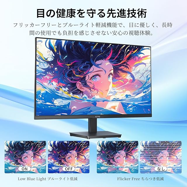 【快適な視覚体験】IPSパネルとブルーライト軽減機能が長時間の作業でも目に優しく、疲れにくい。
