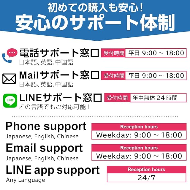 365日対応可能なLINEでの問い合わせ窓口あり、お困りごとなど解決までサポートいたします。(多言語対応)