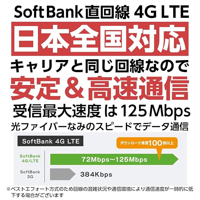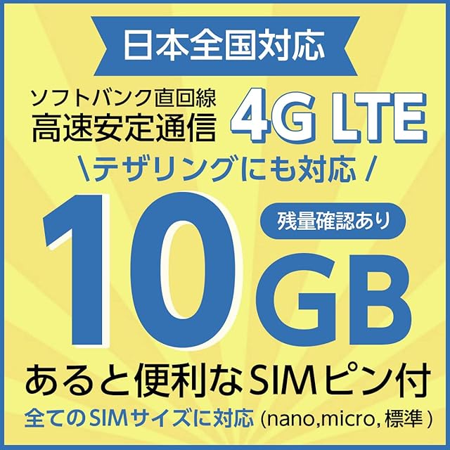 【ソフトバンク直回線だから高速安定通信】SIMの有効期限内であれば、SoftBank の 4G LTE 高速データ容量10GBまで使えます。格安SIMの借り受け回線とは違い直回線を利用するので、利用エリアや速度は安定、テザリング利用も可能です。