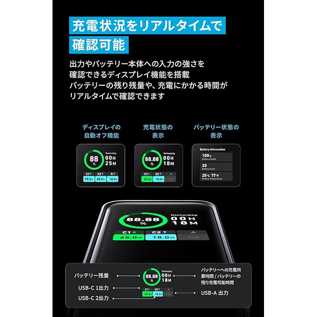 充電状況をリアルタイムで確認可能:出力やバッテリー本体への入力の強さが確認できるディスプレイ機能を搭載。バッテリーの残り残量や充電にかかる時間がリアルタイムで確認できます。