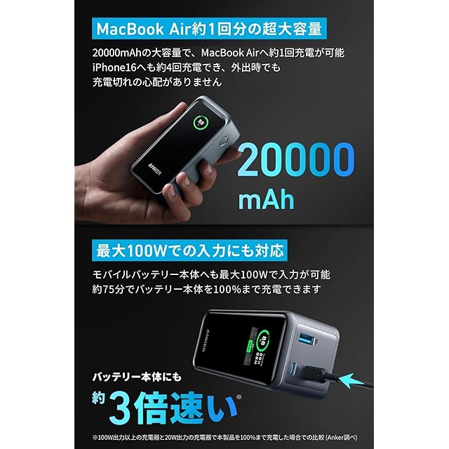 MacBook Air約1回分の大容量:20000mAhの大容量で、MacBook Airへ約1回充電が可能。iPhone 16にも約4回充電でき、外出時でも充電切れの心配がありません。