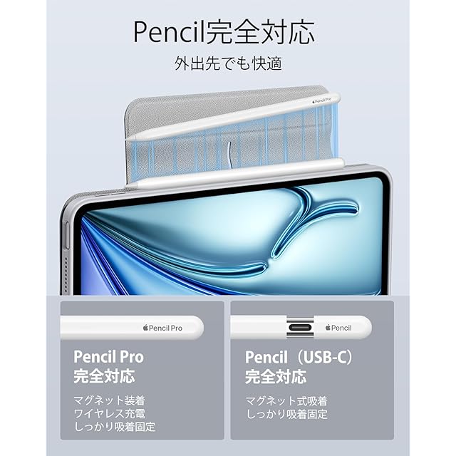 【Pencil Pro&Pencil (USB-C)対応】:Pencil Proへ完全対応かつ、磁気充電用の側面の溝と、Pencilをしっかりと固定するマグネットクラスプを備えています