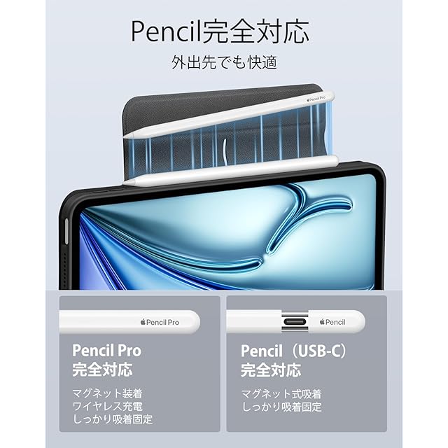 【Pencil Pro&Pencil (USB-C)対応】:Pencil Proへ完全対応かつ、磁気充電用の側面の溝と、Pencilをしっかりと固定するマグネットクラスプを備えています