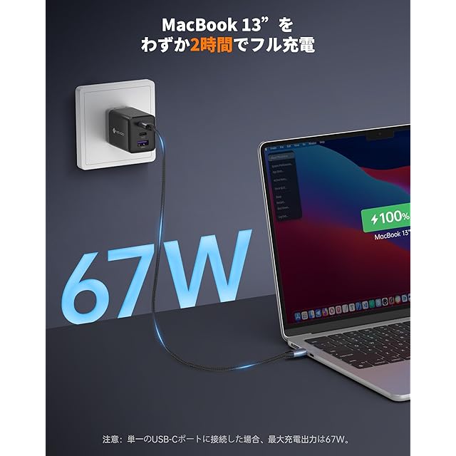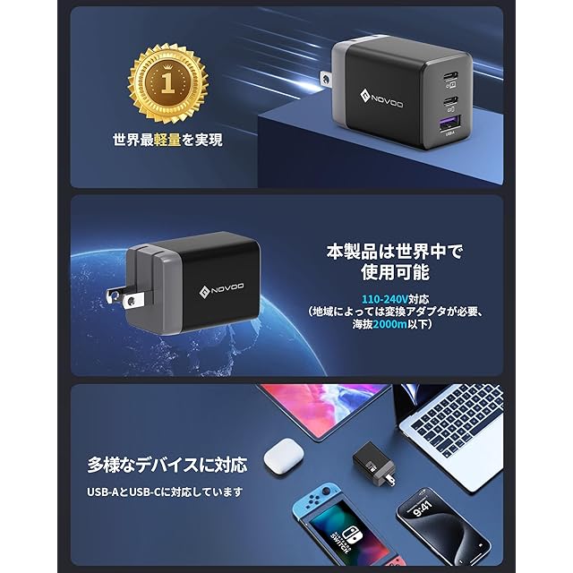 高速で効率的で多様な充電ソリューションをお探しですか?NOVOO 67W USB C PD充電器をお試しください!ノートパソコン、タブレット、スマートフォンの充電速度が比類ないほど速いです。2 * USB-CポートとUSB-Aポートを搭載し、USB-Cは67W、USB-Aは22.5Wの単一出力を提供します。デバイスを効率的にパワーアップする迅速な充電器です! 注意:お使いのデバイスがPD プロトコルをサポートしている場合、単USB-C ポートでは最大67W出力可能です。