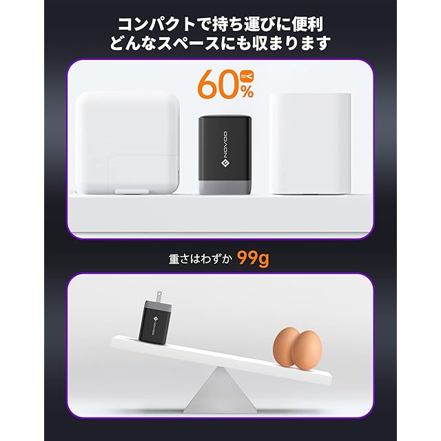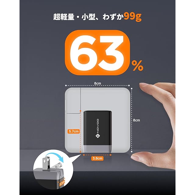 超小型で最軽量、持ち運びに便利な充電器をお探しですか? NOVOO USB Type-C 充電器がぴったりです!最新のGaN IIIテクノロジーにより、標準のノートパソコン充電器の60%小さくなっており、重さはわずか99gで、持ち運びに最適です。また、折りたたみ式プラグ設計により、パワーを犠牲にすることなくバッグやポケットに簡単に収納できます。