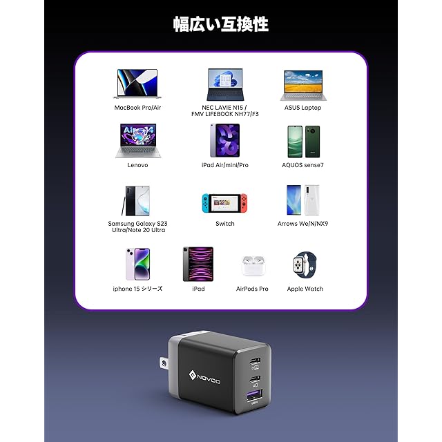 すべてのデバイスに対応する充電器をお探しですか? NOVOO RG67 67W USB-C アダプターがお勧めです!MacBook Pro 16、MacBook Air M2 2022、iPad Pro、iPhone 15 Pro Max、Galaxy S24、Switch、Steam Deck、DJI MINI 3 Proなど、幅広いデバイスに対応しており、あなたのすべてのデバイスの究極の充電ソリューションとなります。