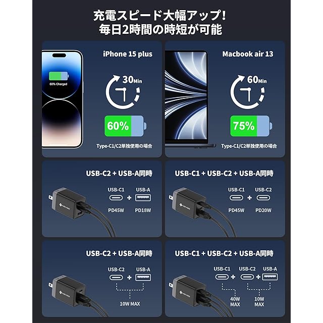 ⚡市場で最速の充電速度を体験したいですか? NOVOO USB-C 充電器をお試しください!最大67Wの電力出力により、MacBook Air M2をわずか30分で最大55%まで充電できます。iPhone 15 Pro MaxやSamsung S24 Ultraわずか30分で最大60%まで充電できます。限られた時間や緊急の仕事にも対応します。自由にデバイスを素早く充電し、コンセントに縛られない生活を想像してみてください。