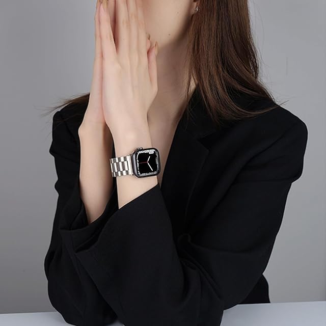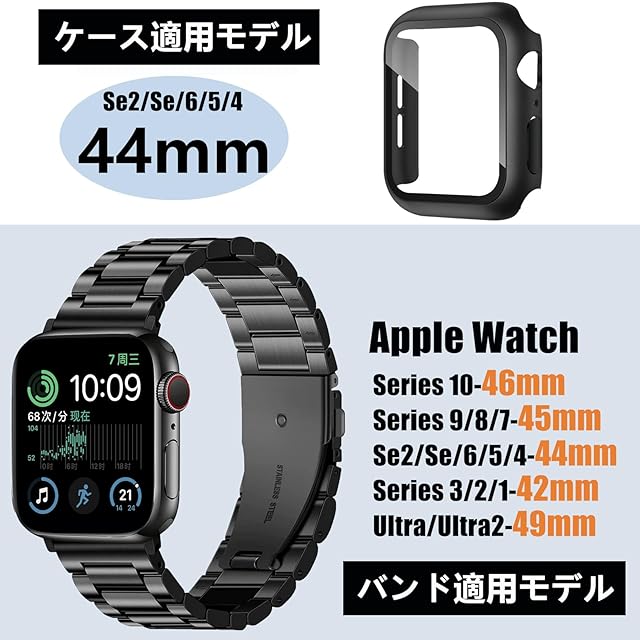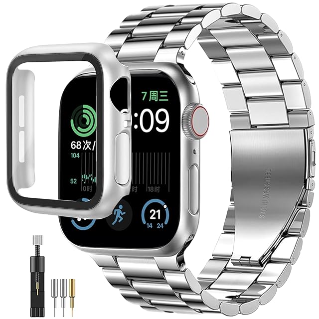 【保護ケース付き】PC素材と硬度強化ガラスで作成された 一体型 apple watch カバー。360度で腕時計を落下衝撃や傷から全面的に保護。バンド横3列になったコマを縦に繋ぎ合わせたブレスレットで、高い堅牢性を持っています。ほとんどの時計メーカーで採用されている3コマモデルで、金属ブレスとしては一番オーソドックスなタイプになります。