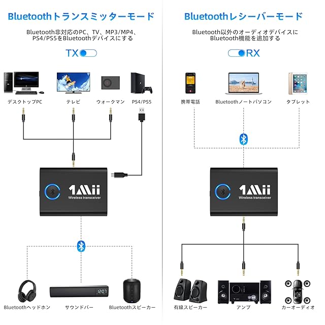 【Bluetoothトランスミッター&レシーバー】1Mii ML301 ブルートゥース 送受信機はBluetooth トランスミッターとBluetooth レシーバーとして使用できます。TXモード-Bluetooth非対応のテレビ、フライト、フィットネスデバイスやPCから、Bluetooth対応のヘッドホン/スピーカーに簡単にオーディオをストリーミングできます。RXモード-スマホ、タブレット、ラップトップからホームステレオ、有線スピーカー、車にワイヤレスコンテンツを送信します。3.5mm AUX端子を持つ機器で動作します。